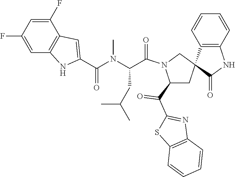 Amine compound 1-7 (73 mg, 0.158 mmol) and acid compound 1-8 (70.1 mg, 0.216 mmol) were dissolved in DMF (0.788 ml). At 0° C., HOAt (0.6 M in DMF) (52.5 μl, 0.032 mmol), 2,4,6-trimethylpyridine (62.4 μl, 0.473 mmol), and HATU (78 mg, 0.205 mmol) were added. The mixture was stirred at 0° C. for 1 h, warmed to rt, and stirred for 1 h. The reaction was quenched with 5% NaHCO3, and extracted with DCM. The organic layer was washed with brine, dried with MgSO4, and concentrated in vacuo. Purification of the residue on silica gel with 0-50% EtOAc/cyclohexane, followed by prep HPLC (50-85% MeCN/water, with 0.1% FA) afforded Example 1 (2.0 mg). 1H NMR (400 MHz, Acetone-d6) δ 10.84 (s, 1H), 9.68 (s, 1H), 8.26 (m, 2H), 7.75-7.64 (m, 2H), 7.27 (d, J=7.6 Hz, 1H), 7.14 (t, J=7.9 Hz, 1H), 7.08 (d, J=9.3 Hz, 1H), 7.00-6.92 (m, 3H), 6.74 (td, J=10.3, 2.1 Hz, 1H), 6.06 (dd, J=10.3, 8.0 Hz, 1H), 5.60 (t, J=7.6 Hz, 1H), 4.36 (d, J=10.6 Hz, 1H), 4.14 (d, J=10.0 Hz, 1H), 3.44 (s, 3H), 2.72-2.53 (m, 2H), 1.83-1.67 (m, 1H), 1.60 (m, 1H), 0.96 (dd, J=19.9, 6.6 Hz, 6H). LC-MS, ES−: 654.2 [M−H]. Example 2 (1.3 mg). 1H NMR (400 MHz, Acetone-d6) δ 11.09 (s, 1H), 9.59 (s, 1H), 8.25 (d, J=7.8 Hz, 1H), 8.18 (d, J=8.2 Hz, 1H), 7.63 (t, J=7.6 Hz, 1H), 7.56 (t, J=7.9 Hz, 1H), 7.40 (d, J=7.4 Hz, 1H), 7.25 (td, J=7.7, 1.2 Hz, 1H), 7.13 (d, J=8.2 Hz, 1H), 7.06-6.94 (m, 3H), 6.83-6.74 (m, 1H), 6.08 (t, J=9.0 Hz, 1H), 5.73-5.65 (m, 1H), 4.21 (d, J=11.3 Hz, 1H), 4.10-4.01 (m, 1H), 3.24 (s, 3H), 2.92-2.85 (m, 1H), 2.60 (m, 1H), 1.84-1.72 (m, 1H), 1.69 (d, J=8.0 Hz, 1H), 1.63-1.53 (m, 1H), 1.02-0.87 (m, 6H). LC-MS, ES−: 654.2 [M−H].