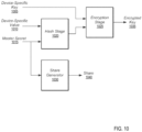 Referring now to FIG. 10 , a block diagram of one embodiment of the generation of an encrypted key and a share is shown. The block diagram illustrates the generation of an encrypted key and share for each storage device (not shown) of an overall storage system (not shown). Device-specific key 1005 is representative of a key that is used to encrypt data stored on a specific storage device. Device-specific value 1010 is representative of any value or combination of values unique to the specific storage device. Master secret 1015 is representative of the shared secret in a secret sharing scheme.