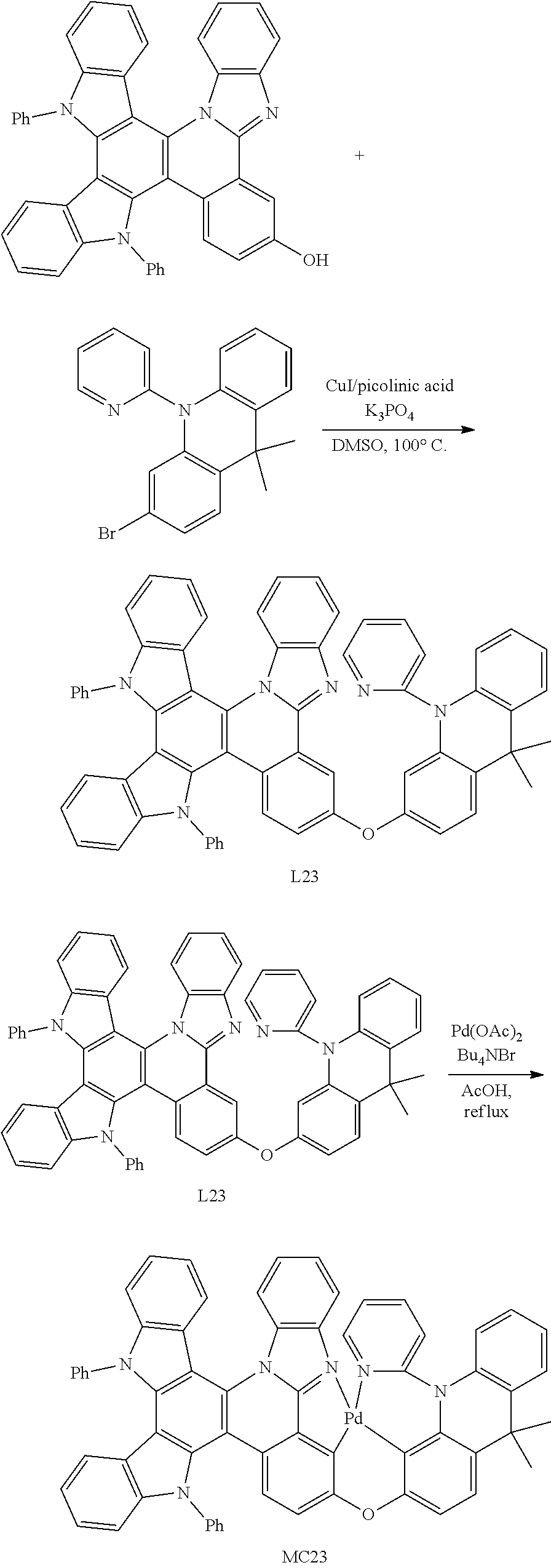 5,20-diphenyl-5,20-dihydrobenzo[4,5]imidazo[1,2-f]diindolo[2,3-a:2′,3′-c]phenanthridin-8-ol (1 mmol, 1.0 eq), 3-bromo-9,9-dimethyl-10-(pyridin-2-yl)-9,10-dihydroacridine (1.2 mmol, 1.2 eq), CuI (0.2 mmol, 0.2 eq), picolinic acid (0.4 mmol, 0.4 eq) and K3PO4 (2 mmol, 2.0 eq) were added to a dry Shlenck tube equipped with a magnetic stir bar. The tube was evacuated and backfilled with nitrogen. The evacuation and backfill procedure was repeated for a total of three times. Then solvent DMSO (10 mL) was added under the protection of nitrogen. The mixture was stirred in an oil bath at a temperature of 100° C. for 3 days and then cooled down to ambient temperature, diluted with ethyl acetate. The mixture was washed with water three times and then dried over sodium sulfate and filtered. The solvent was removed under reduced pressure, and the residue was purified through column chromatography on silica gel using hexane/ethyl acetate as eluent to obtain the desired product L23 in 30%˜70% yield.