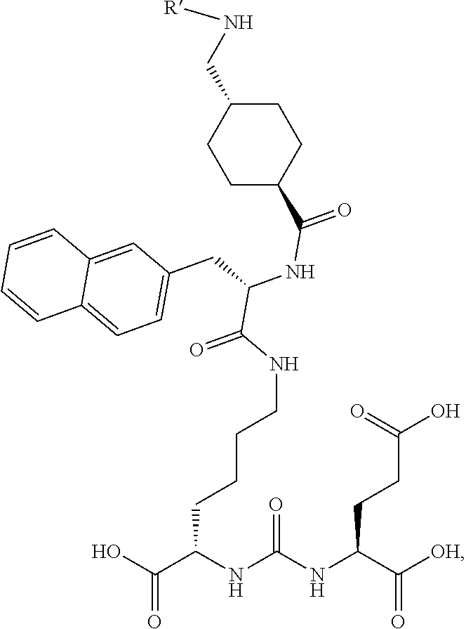 - PSMA possesses the criteria of a promising target for therapy, i.e., abundant and restricted (to prostate) expression at all stages of the disease, presentation at the cell surface but not shed into the circulation and association with enzymatic or signaling activity (Schulke, N.; et al. Proc. Natl. Acad. Sci. USA 2003, 100, 12590-12595).