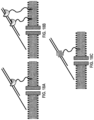 FIGS. 21A-21D show a schematic of one way of using a polynucleotide binding protein to control DNA movement through a nanopore employing a hybridised tether. FIG. 21A) A DNA analyte (consisting of a ssDNA leader (grey region) attached to a dsDNA region) is coupled to the membrane using a hybridised tether, resulting in a concentration enhancement at the membrane surface. A polynucleotide binding protein capable of controlling DNA movement is added to the cis compartment where it binds to the 4 bp overhang. FIG. 21B) Under an applied voltage, the DNA analyte is captured by the nanopore via the 5′ leader section (grey region) on the DNA. FIG. 21C) Under the force of the applied field the DNA is pulled into the pore until the bound polynucleotide binding protein contacts the top of the pore and prevents further uncontrolled translocation. In this process the polynucleotide which is tethered to the membrane (dashed line) is stripped off to be sequenced (black strand with grey leader region). FIG. 21D) In the presence of appropriate cofactors, the polynucleotide binding protein on top of the pore moves along the DNA and controls the translocation of the DNA through the pore. The movement of the polynucleotide binding protein, along the DNA in a 3′ to 5′ direction, pulls the threaded DNA out of the pore against the applied field back to the cis compartment. The last section of DNA to pass through the nanopore is the 5′-leader. The arrow indicates the direction of DNA movement.