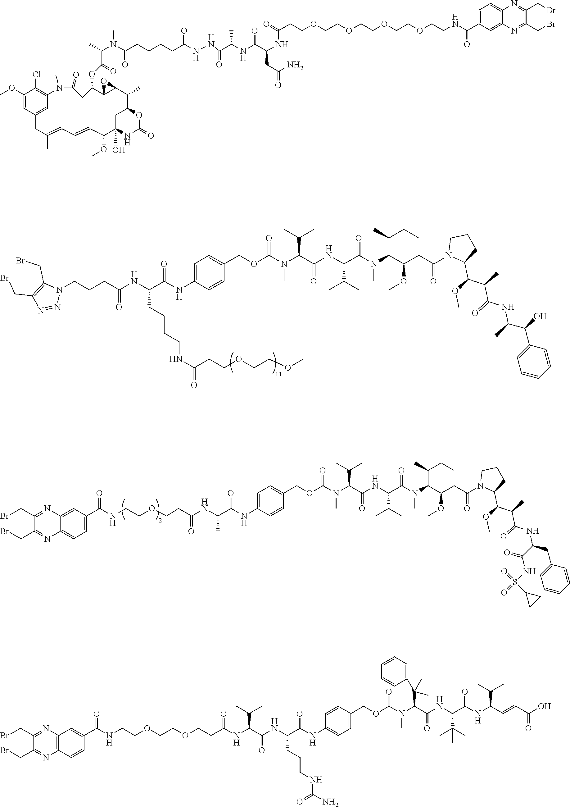 - At least one L 2 includes a peptide, an oligosaccharide, —(CH 2 ) n —, —(CH 2 CH 2 O) n —, Val-Cit-PAB, Val-Ala-PAB, Val-Lys(Ac)-PAB, Phe-Lys-PAB, Phe-Lys(Ac)-PAB, D-Val-Leu-Lys, Gly-Gly-Arg, Ala-Ala-Asn-PAB, Ala-PAB, PAB or combinations thereof.
