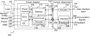 The control attachment comprises elements for receiving the power from the power adapter, and selectively applying power to a load by way of the signal interface 3915. More particularly, the control attachment 3904 comprises a control circuit 3936 adapted to receive signals from various interfaces and control a dimmer control circuit 3937 for providing the power to a load by way of the connector elements 3922 and 3924. The control attachment comprises various actuators in a user interface for receiving input signals that may be used by the control circuit 3936 to control the dimmer controller, and generate output signals. An actuator 3938 comprises a user interface input 3940 for receiving user interface input. By way of example, the actuator 3930 may comprise an on off button. An actuator 3942 comprises a user interface input 3944 for receiving additional user interface input, such as dimmer control input. An additional interface 3946 may be coupled to a feedback circuit 3948, and may receive signals by way of a communication interface 3950 and generate feedback signals by way of a feedback output 3952. The communication signals provide to the control attachment may be wireless communication signals for example. The feedback signals may be any type of audio or visual feedback signals for any type of user interface as described herein. Accordingly, the power adapter 3902 is configured to receive high voltage power from an interface of the power adapter, where the power is routed through the control attachment and back to the power adapter to be provided to the load. By configuring the switching control of power of the power adapter arrangement of FIG. 39 in the control attachment, it is possible to provide a simplified power adapter, where the functionality of the switching is provided in the control attachment.