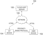 Referring now to FIG. 1 , there is illustrated a system 100 according to embodiments of the present disclosure. The system 100 includes a user device 102, which can be any suitable device, such as a mobile phone, a laptop computer, a tablet, a wearable device, or the like. The system further includes an IoT device 104, which can be any suitable device, such as a smart surveillance camera, a smart speaker, a doorbell camera, a smart door lock, a smart thermostat, or the like. In some embodiments, the user device 102 and the IoT device 104 are capable of connecting to each other using a proximity based protocol such as near-field communication (NFC), BLUETOOTH® Low Energy (BLE), or the like. The system additionally includes a cloud host server 106, which connects to the user device 102 and the IoT device 104 through a network 108, such as the Internet. In some embodiments, the cloud host server 106 connects to the user device 102 and the IoT device 104 using a protocol such as HTTPS. It is understood that the system 100 can include any number of each of the user device 102, the IoT device 104 and the cloud host server 106.