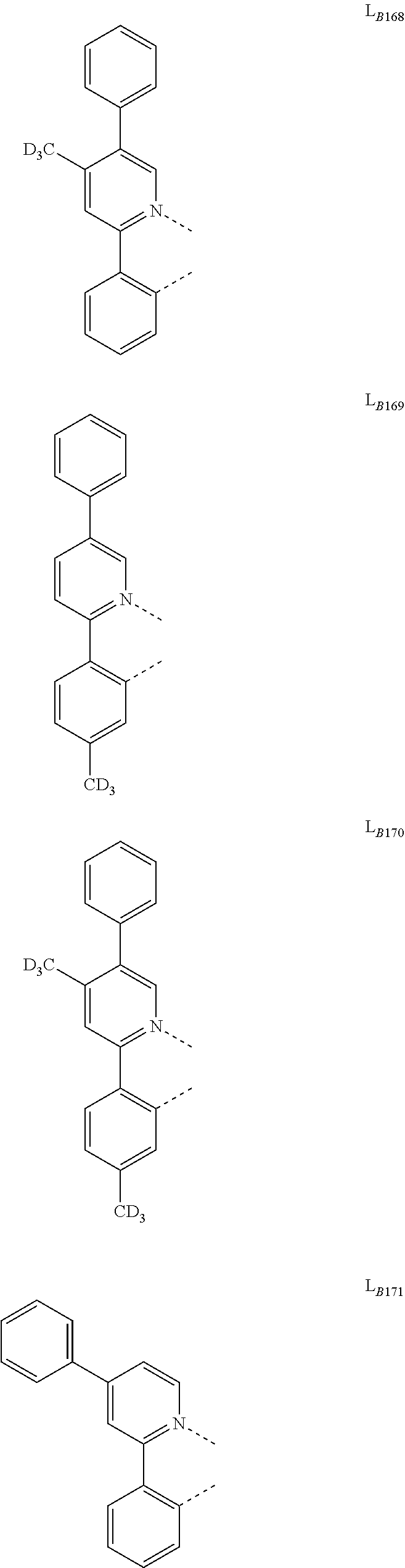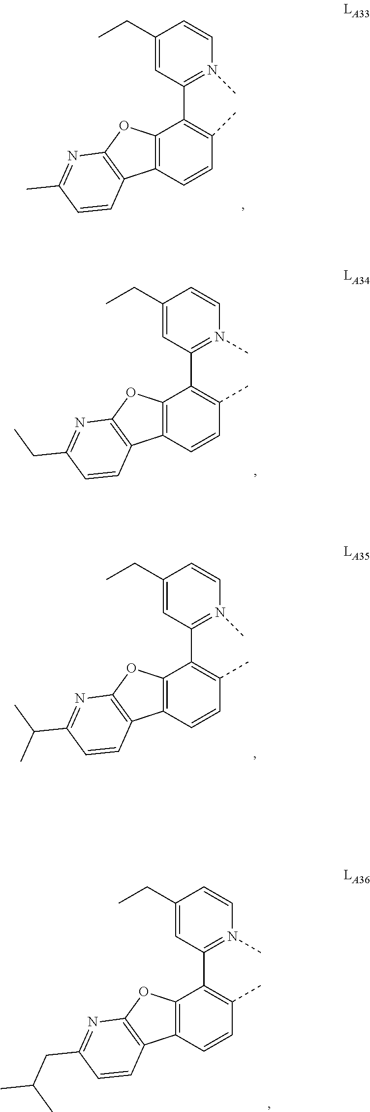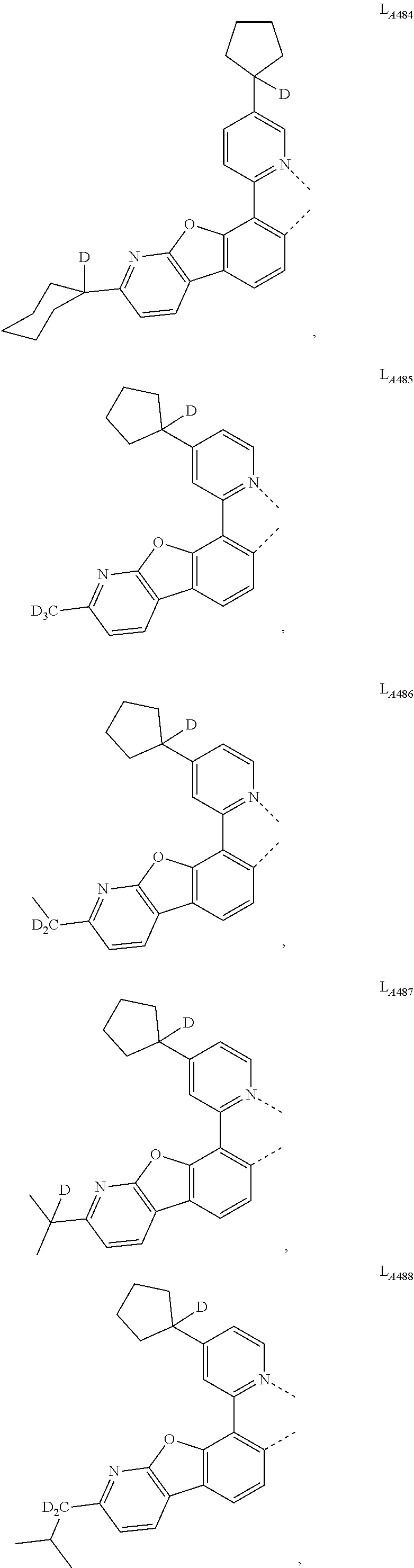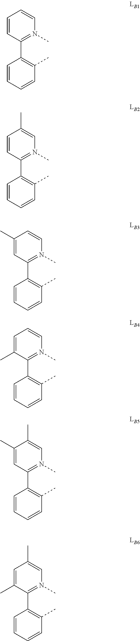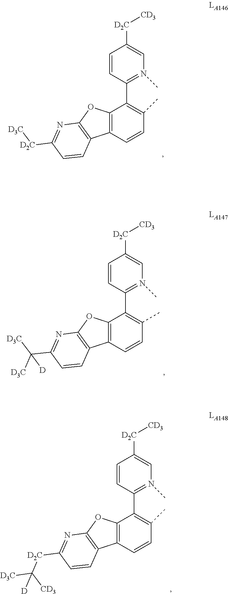 In another embodiment of the compound disclosed herein, the compound is selected from the group consisting of Compound A-1 through Compound A-146,598, wherein each of Compound A-x, where x=461j+k−461, k is an integer from 1 to 461, and j is an integer from 1 to 318, has the formula Ir(LAk)(LBj)2 and from the group of Compound B-1 through Compound B-146,598, wherein each Compound B-x, where x=461j+k−461, k is an integer from 1 to 461, and j is an integer from 1 to 318, has the formula Ir(LAk)2(LBj).