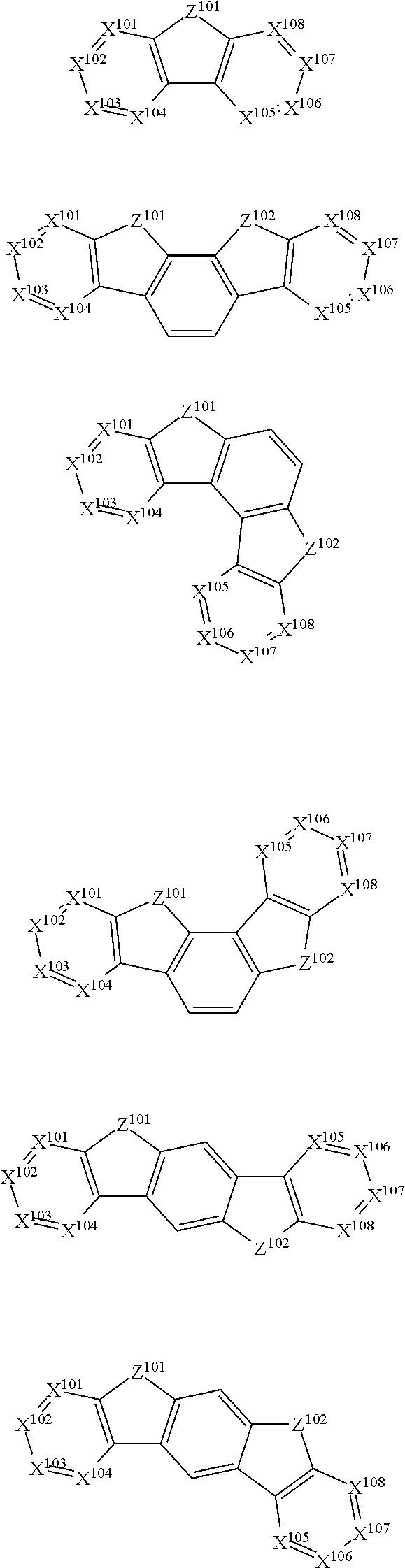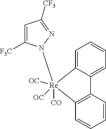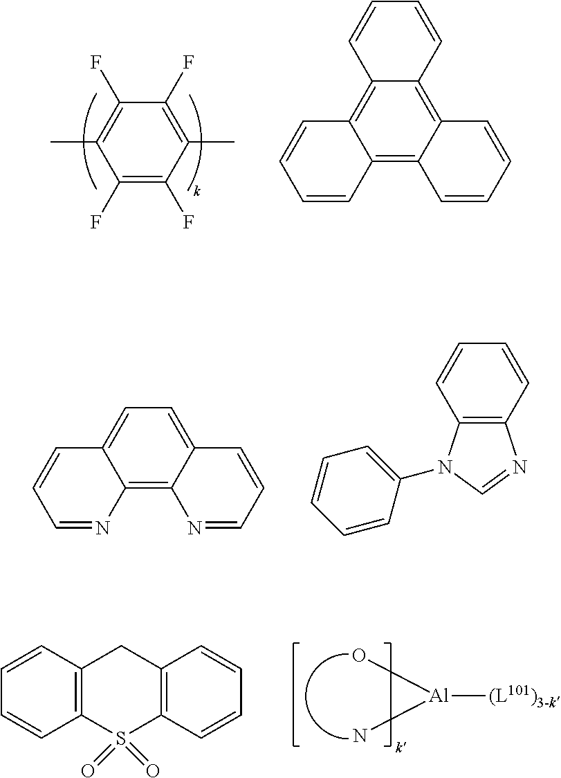 More examples for each of these layers are available. For example, a flexible and transparent substrate-anode combination is disclosed in U.S. Pat. No. 5,844,363, which is incorporated by reference in its entirety. An example of a p-doped hole transport layer is m-MTDATA doped with F4-TCNQ at a molar ratio of 50:1, as disclosed in U.S. Patent Application Publication No. 2003/0230980, which is incorporated by reference in its entirety. Examples of host materials are disclosed in U.S. Pat. No. 6,303,238 to Thompson et al., which is incorporated by reference in its entirety. An example of an n-doped electron transport layer is BPhen doped with Li at a molar ratio of 1:1, as disclosed in U.S. Patent Application Publication No. 2003/0230980, which is incorporated by reference in its entirety. U.S. Pat. Nos. 5,703,436 and 5,707,745, which are incorporated by reference in their entireties, disclose examples of cathodes including compound cathodes having a thin layer of metal such as Mg:Ag with an overlying transparent, electrically-conductive, sputter-deposited ITO layer. The theory and use of blocking layers is described in more detail in U.S. Pat. No. 6,097,147 and U.S. Patent Application Publication No. 2003/0230980, which are incorporated by reference in their entireties. Examples of injection layers are provided in U.S. Patent Application Publication No. 2004/0174116, which is incorporated by reference in its entirety. A description of protective layers may be found in U.S. Patent Application Publication No. 2004/0174116, which is incorporated by reference in its entirety.