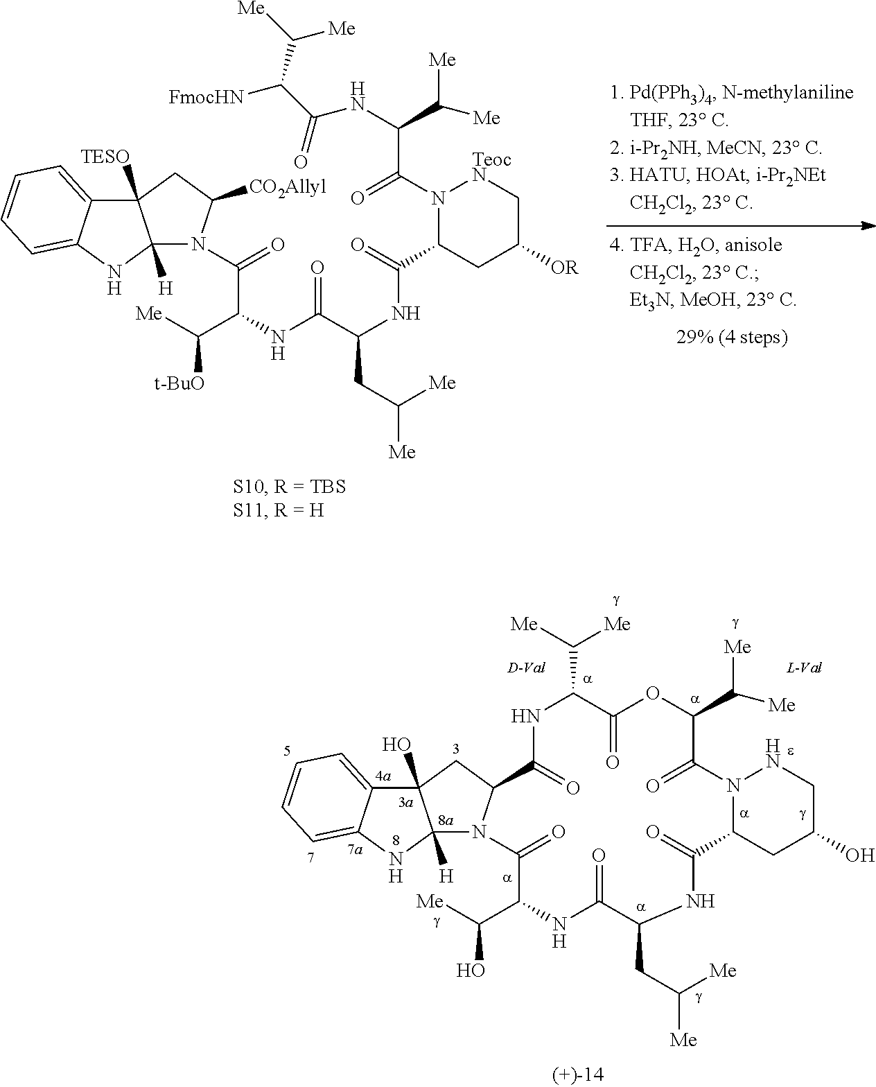 FIG. 8 shows the synthesis of cyclotryptophan (−)-12. Diastereoselective bromocyclization secures efficient gram-scale access to (−)-12 from commercially available tryptophan precursor (+)-S3. Reagents and conditions: (a) H2C═CHCH2OH, T3P, pyridine, 0→23° C.; (b) NBS, PPTS, CH2Cl2, 23° C.; (c) AgSbF6, H2O, DTBMP, MeNO2, 23° C.; (d) TESOTf, i-Pr2NEt, CH2Cl2, 0→23° C.; (e) piperidine, MeCN, 23° C. Boc=tert-butyloxycarbonyl; DTBMP=2,6-di-tert-butyl-4-methylpyridine; Fmoc=9-fluorenylmethoxycarbonyl; NBS=N-bromosuccinimide; PPTS=pyridinium para-toluenesulfonate; T3P=propanephosphonic acid anhydride; TES=triethylsilyl.