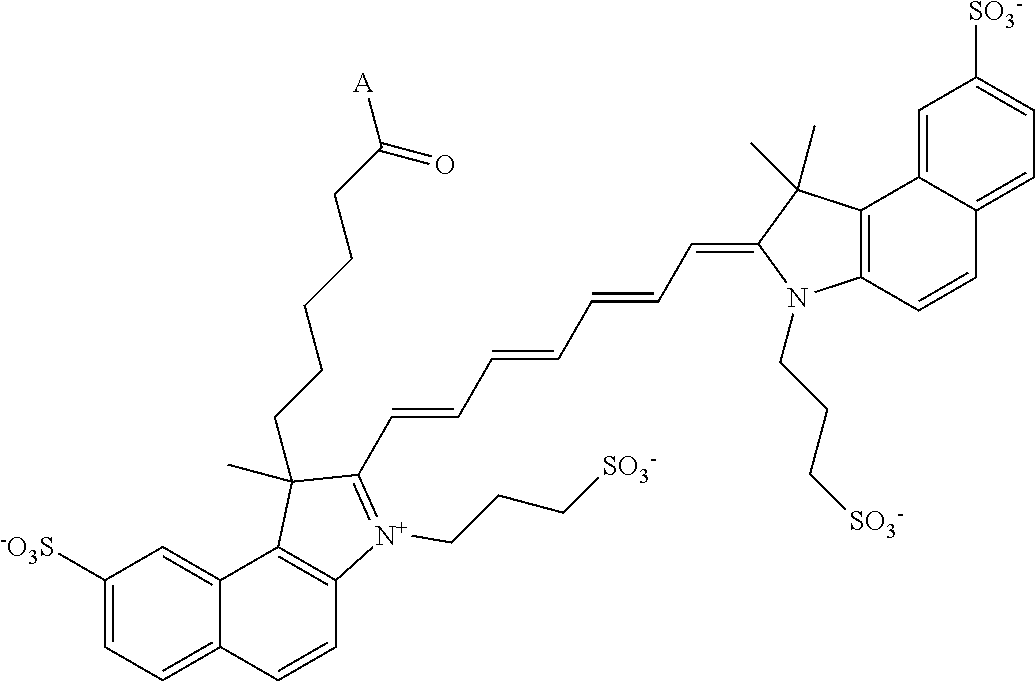 Subjects B002 and B014 were ER−, PR−, and HER2− (triple negative). All other subjects were ER+, and all but three subjects were PR+. Only B017 was HER2+, all other subjects were HER2−. Subject B017 was treated prior to surgery and residual IDC was not detected in the mastectomy specimen. FIG. 26 illustrates a SIRIS image of invasive ductal carcinoma in subjects B002, B004, and B006. Molecular marker subtype expression is shown below each image. Fluorescence signal, corresponding to lighter and brighter areas in the NIR images, is indicative of the presence of Compound 76 in tumor tissues. Compound 76 was detected in subjects with IDC and fluorescence signal was not hindered by expression or lack of expression of ER or PR. A seven-fold difference in fluorescence signal between tumor and non-tumor regions was observed in the subject with triple-negative breast cancer.