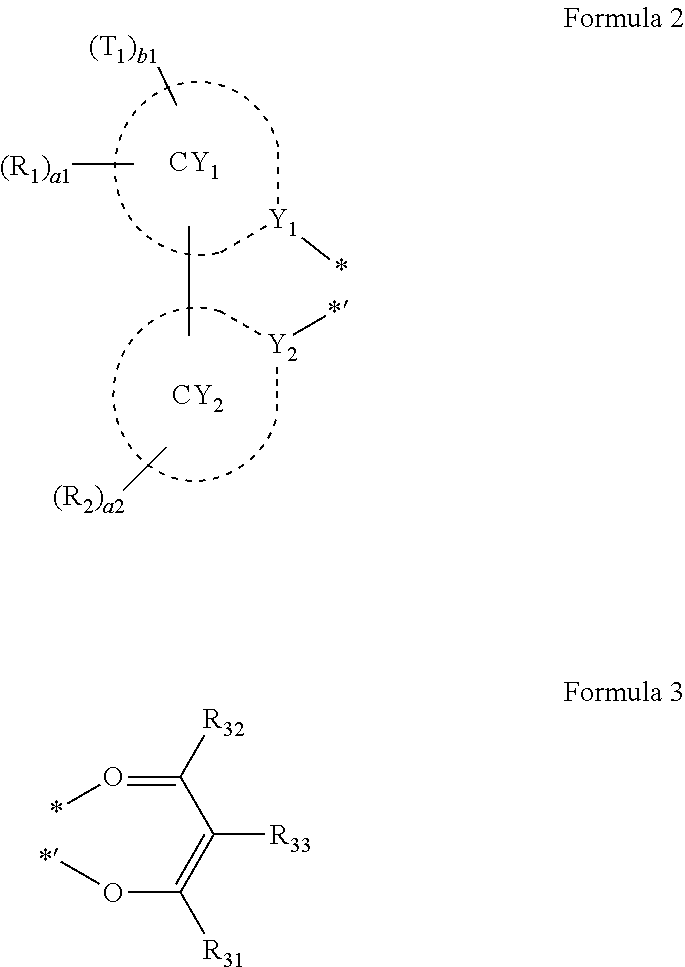 • L 1 is a ligand represented by Formula 2, wherein one of two L 1 s is a first L 1 ligand and the other L 1 s is a second L 1 ligand and the first L 1 ligand and the second L 1 ligand are identical to each other,