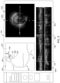 FIG. 8 is a schematic illustration of the display showing an example extravascular image, and showing corresponding intravascular imaging including transverse cross-sectional and longitudinal cross-sectional images, obtained during an ending portion of a translation procedure;