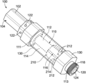Alternatively, a heater and wick arrangement can be utilized, where the wick is positioned to extend through the central air passage of the inner tube 112, and provide a consistent heat source to the liquid substance. The heater and wick arrangement can include an electrical heating element 120. The heater portion of the heater and wick arrangement preferably includes an electrically resistive material. The heating element 120 and the associated cartridge are secured by the securing end 130 of the e-vaping apparatus. The securing end 130 is configured to screw on to the e-vaping apparatus in order to secure the heating element 120 to the cartridge 110. Suitable electrically resistive materials include but are not limited to: semiconductors such as doped ceramics, electrically “conductive” ceramics (such as, for example, molybdenum disilicide), carbon, graphite, metals, metal alloys and composite materials made of a ceramic material and a metallic material. Such composite materials may include doped or undoped ceramics.