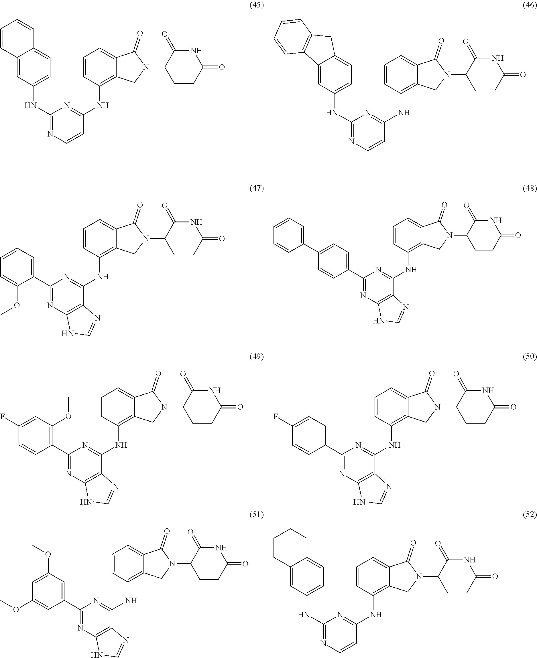 - Further aspects of the present invention are directed to methods of treating diseases or disorders involving aberrant activity of a protein that may be a substrate for a complex containing cereblon and the compound, that entails administration of a therapeutically effective amount of a compound of the invention to a subject in need thereof.