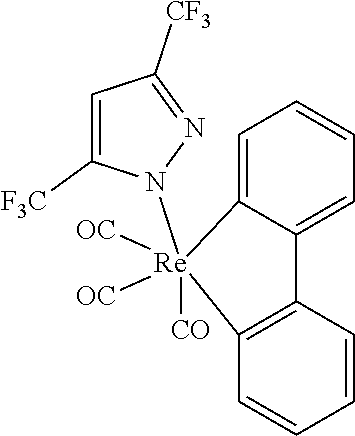 Table 8 provides a comparison of device properties between Device Examples 16-29 and Comparative Examples 4 and 6. From the data, it can be seen that Device Examples 16 (Compound 21), 17 (Compound 22), 19 (Compound 25), 20 (Compound 26), 21 (Compound 27), 23 (Compound 29), 24 (Compound 30), 25 (Compound 31), 27 (Compound 34), 28 (Compound 25), 29 (Compound 37) provide high efficiency and long device lifetime. Particularly, Device Examples 16, 17, 19, 23, 24, 25 and 27, which use Compounds 21, 22, 25, 29, 30, 31 and 34 respectively as the emitting dopant, have very good device performance. These particular devices show an RT80% (defined as the time required for the initial luminance Lo to drop to from 100% to 80% at room temperature under constant DC drive) of 210, 260, 245 237, 223, 254 and 290 h compared to an RT80% of 196 h of Comparative Device Example 4. Furthermore, Device Examples 16, 17, 19, 23, 24, 25 and 27 all operate at higher L0 than Comparative Device Example 4. The result indicates that the phenyl C-ring may improve the device stability by adding some conjugation to emitting dopant. However, the conjugation is limited by the presence of the twist feature, described above, which does not cause significant red-shift in emission compared to a phenyl in regular conjugation as in E-3. In addition, the EL spectra of Device Examples 16-20, 23-25 and 27-29 are all narrower than that of Comparative Example 4. Narrow emission may be an desirable factor for achieving saturated color coordinates, high LE:EQE conversion, microcavity tuning, and color filter matching in OLED technology.