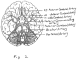 FIGS. 1 and 2 show schematic illustrations of the brain's blood vessels. Each cerebral hemisphere is supplied by an internal carotid artery, which arises from a common carotid artery beneath the angle of the jaw, enters the cranium through the carotid foramen, traverses the cavernous sinus, penetrates the dura and divides into the anterior and middle cerebral arteries. The large surface branches of the anterior cerebral artery supply the cortex and white matter of the inferior frontal lobe, the medial surface of the frontal and parietal lobes and the anterior corpus callosum. Smaller penetrating branches supply the deeper cerebrum and diencephalon, including limbic structures, the head of the caudate, and the anterior limb of the internal capsule. The large surface branches of the middle cerebral artery supply most of the cortex and white matter of the hemisphere's convexity, including the frontal, parietal, temporal and occipital lobes, and the insula. Smaller penetrating branches supply the deep white matter and diencephalic structures such as the posterior limb of the internal capsule, the putamen, the outer globus pallidus, and the body of the caudate. After the internal carotid artery emerges from the cavernous sinus, it gives off the ophthalmic artery, which supplies the eye, and it also gives off the anterior choroidal artery, which supplies the anterior hippocampus and, at a caudal level, the posterior limb of the internal capsule. Each vertebral artery typically arises from a subclavian artery, enters the cranium through the foramen magnum, and gives off an anterior spinal artery and a posterior inferior cerebellar artery. The vertebral arteries join at the junction of the pons and the medulla to form the basilar artery, which at the level of the pons gives off the anterior inferior cerebellar artery and the internal auditory artery, and, at the midbrain, the superior cerebellar artery. The basilar artery then divides into the two posterior cerebral arteries. The large surface branches of the posterior cerebral arteries supply the inferior temporal and medial occipital lobes and the posterior corpus callosum; the smaller penetrating branches of these arteries supply diencephalic structures, including the thalamus and the subthalamic nuclei, as well as part of the midbrain (see Principles of Neural Sciences, 2d Ed., Eric R. Kandel and James H. Schwartz, Elsevier Science Publishing Co., Inc., New York, pp. 854-56 (1985)).