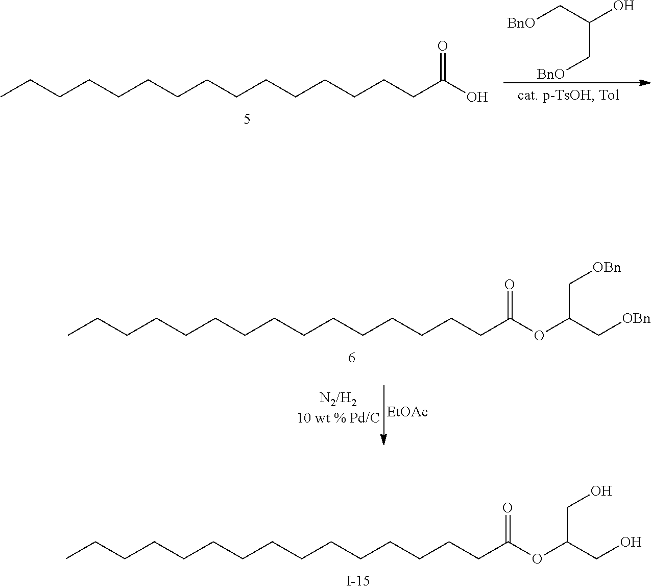 All reagents and solvents were purchased and used without further purification unless specified. Palmitic acid (98%) was purchased from Sigma-Aldrich. p-TsOH and MTBE were purchased from Alfa-Aesar. Toluene, Et2O, and EtOAc were purchased from VDR. Lipozyme® TL IM lipase was purchased from Novozymes. 10 wt % Pd/C was purchased from Strem Chemicals and used as received. All reactions were carried out under an atmosphere of air with non-dried solvents unless otherwise stated. Yields refer to chromatographically and spectroscopically (1H NMR) homogeneous materials, unless otherwise stated. Reactions were monitored by thin layer chromatography (TLC) carried out on 0.25 mm E. Merck silica gel plates (60F-254) using UV light as the visualizing agent and an acidic mixture of anisaldehyde, ceric ammonium molybdate, or basic aqueous potassium permangante (KMnO4), and heat as developing agents. NMR spectra were recorded on a Bruker Avance 500 MHz and/or Varian VNMRs 600 MHz instruments and calibrated using residual un-deuterated solvent as an internal reference (CHCl3 at 7.26 ppm 1H NMR, 77.16 ppm 13C NMR). The following abbreviations (or combinations thereof) were used to explain the multiplicities: s=singlet, d=doublet, t=triplet, q=quartet, m=multiplet, br=broad. Mass spectra (MS) were recorded on a time of-flight mass spectrometer by electrospray ionization (ESI) or field desorption (FD) at the UC Santa Barbara mass spectrometry facility. 1,3-bis(benzyloxy)propan-2-ol was synthesized according to the procedure of Nemoto et al. (J. Org. Chem., 1992, 57, p. 435).