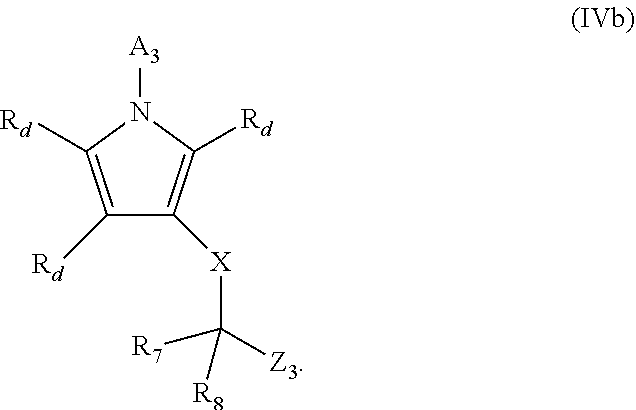 - Ring W is a 5-membered heteroaryl or a 5-membered heterocyclic, wherein each ring carbon atom of said 5-membered heteroaryl is substituted with one R d and wherein each ring nitrogen atom of said 5-membered heteroaryl is substituted with zero or one R d when said nitrogen atom is present, and wherein each ring carbon atom of said 5-membered heterocyclic is substituted with one or two R d and each ring nitrogen atom of said 5-membered heterocyclic is substituted with zero or one R d , when said nitrogen atom or atoms are present;