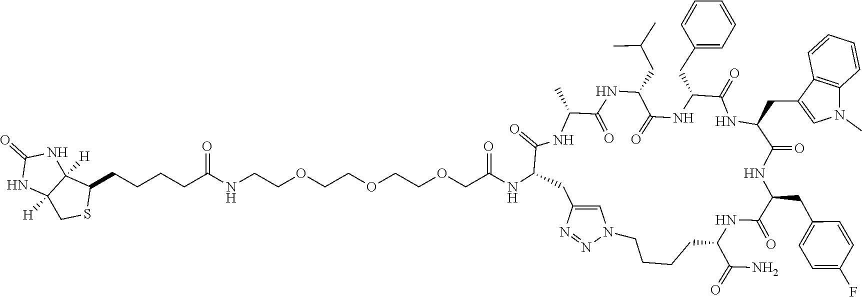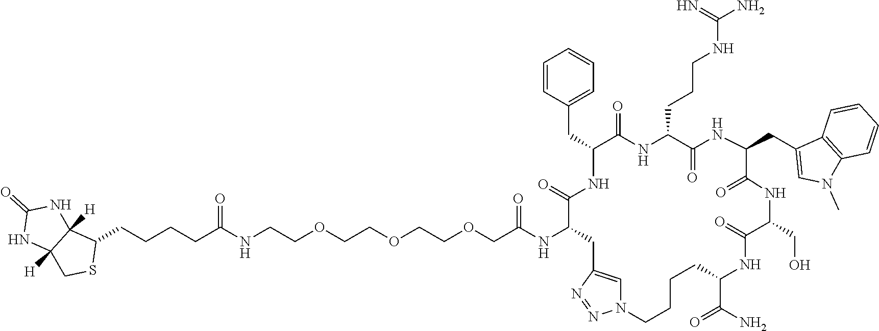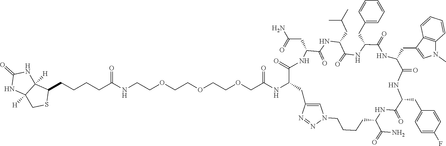 Every compound disclosed herein is intended to be and should be considered to be specifically disclosed herein. Further, every subgroup that can be identified within this disclosure is intended to be and should be considered to be specifically disclosed herein. As a result, it is specifically contemplated that any compound, or subgroup of compounds can be either specifically included for or excluded from use or included in or excluded from a list of compounds. For example, as one option, a group of first ligands is contemplated where each first ligand is as described herein but is not wyray (SEQ ID NO:3), wyry (SEQ ID NO:4), nsfr(Me-Trp) (SEQ ID NO:6), frf(Me-Trp)s (SEQ ID NO:7), wyrX3y, wherein X3 is D-Ala or is not present (SEQ ID NOs:3 and 4), X1rf(Me-Trp)X2, wherein X1 and X2 are independently D-Ala, D-Arg, D-Asn, D-Asp, D-Glu, Gly, D-His, D-Leu, D-Lys, D-Phe, D-Pro, D-Ser, D-Thr, D-Trp, D-Tyr, or D-Val or is not present, arf(Me-Trp)s (SEQ ID NO:20), rf(Me-Trp)s (SEQ ID NO:21), frf(Me-Trp)a (SEQ ID NO:22), frf(Me-Trp) (SEQ ID NO:23), or rf(Me-Trp).