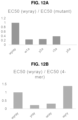 FIGS. 12A-12B: EC50 of wyray and variants of wyray (SEQ ID NO:3). FIG. 12A. Bar graph of EC50 of macrocycle variants of wyray (SEQ ID NO:3) made by substituting any of the five positions with alanine. Variants: w1a (SEQ ID NO:55), y2a (SEQ ID NO:56), r3a (SEQ ID NO:8), y5a (SEQ ID NO:57). FIG. 12B. Bar graph of EC50 of macrocycle variants of wyray (SEQ ID NO:3) made by ring-reduction to produce 4-mer variants. Variants: yray (SEQ ID NO:63), wray (SEQ ID NO:64), wyry (SEQ ID NO:4).