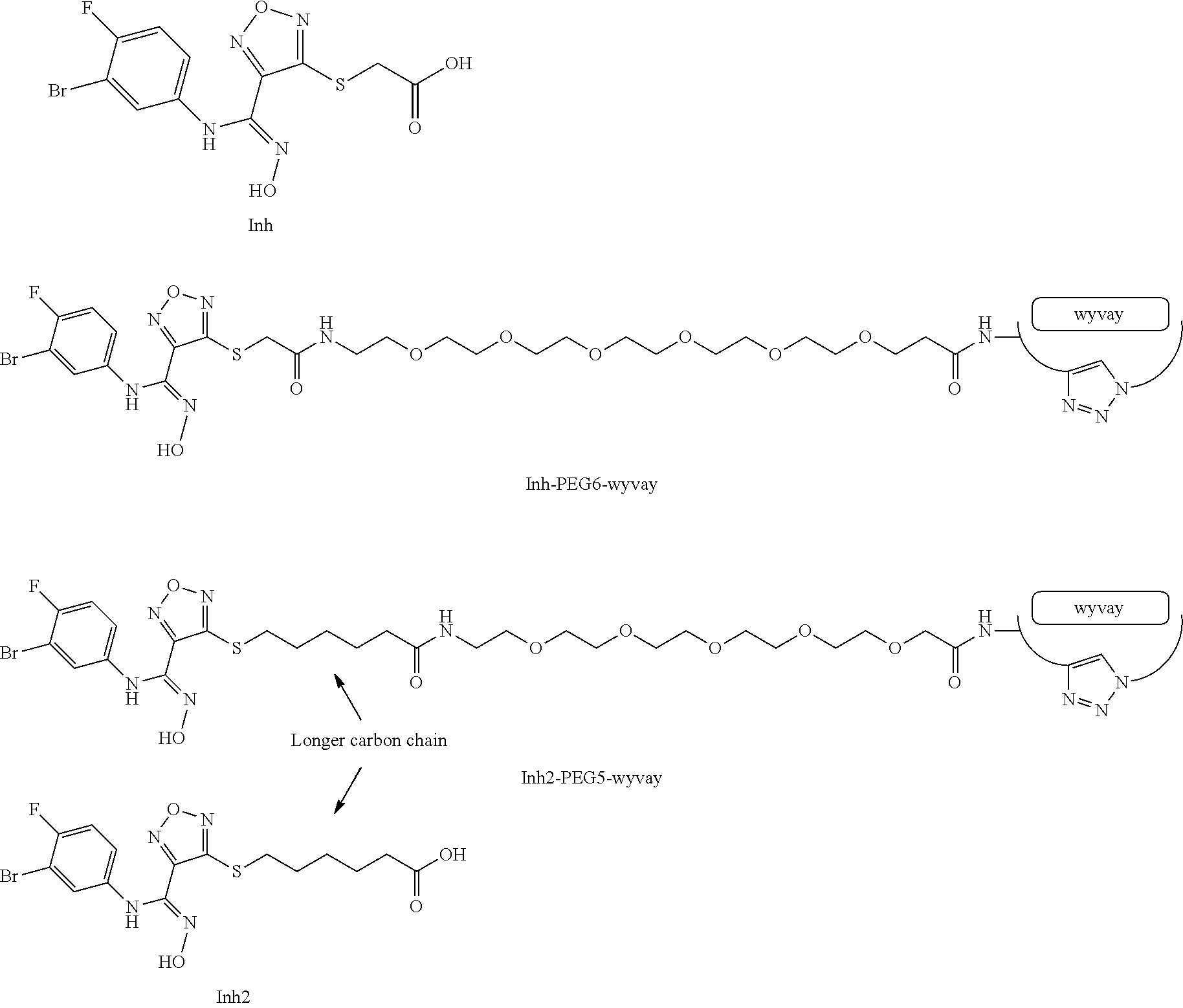 Docking studies estimate that Epitope 2 is too far from the active site of IDO1 to support heterobiligand development. However, Epitope 2 ligands can be used as imaging agents since they can be cell penetrant. Epitope 2 ligands can also be used as a selective targeting moiety to target therapeutic and other agents IDO1 in cells. For example, a proteolysis targeting chimera (PROTAC) can be created from IDO1-binding peptide ligands (as the IDO1 protein binding group), a chemical linker, and E3 ligase ligand (acting as a protein degradation tag). The E3 ligase ligand recruits E3 ligase to the site with the targeting peptide binds (IDO1 in this case). E3 ligase then ubiquitinates the IDO1, which marks IDO1 for degradation. IDO1 binding is maintained when the IDO1-binding peptide ligand is linked to E3 ligase ligand. Operation of a PROTAC is illustrated in FIG. 14 (Corson et al., ACS Chem Biol. 3(11):677-692 (2008)). One important design feature of PROTAC is to have the E3 ligase near to a lysine on IDO1 when the peptide ligand binds to IDO1. Several E3 ligase ligands are available that can recruit E3 ligase to IDO1 when the PROTAC is bound to IDOL. Examples are shown below.