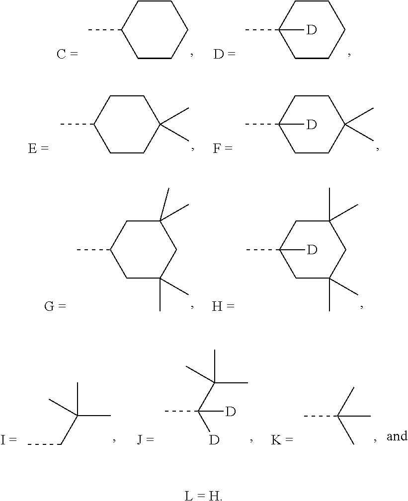 As used herein, “deuterium” refers to an isotope of hydrogen. Deuterated compounds can be readily prepared using methods known in the art. For example, U.S. Pat. No. 8,557,400, Patent Pub. No. WO 2006/095951, and U.S. Pat. Application Pub. No. US 2011/0037057, which are hereby incorporated by reference in their entireties, describe the making of deuterium-substituted organometallic complexes. Further reference is made to Ming Yan, et al., Tetrahedron 2015, 71, 1425-30 and Atzrodt et al., Angew. Chem. Int. Ed. (Reviews) 2007, 46, 7744-65, which are incorporated by reference in their entireties, describe the deuteration of the methylene hydrogens in benzyl amines and efficient pathways to replace aromatic ring hydrogens with deuterium, respectively.