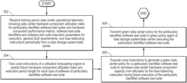 The execution of code instructions for the software test suite green data center policy generation system in an embodiment may train code instructions of a utilization forecasting engine to predict future hardware component utilization rates and execution durations for each particularly identified software test suite at block 304. For example, a software test suite green data center policy generation system 280 in an embodiment may use algorithmic code instructions for a time series utilization forecasting engine 286 that predicts a utilization rate for one or more data center hardware components or data center hardware component groups (e.g., all memory devices, all processors, all PCIe cards or other ASIC cards) within a data storage system/data center 210, based on previously recorded utilization rates for each of such hardware components/groups during execution of a particularly identified software test suite. The code instructions of the time series utilization forecasting engine 286 in an embodiment may be trained based on the data center operational telemetry measurements gathered by the green policy agent 219 over a training period as described above. For example, the utilization forecasting engine 286 operating at the UEM 200 may use the operational telemetry measurements gathered from the green policy agent 219 discussed directly above with respect to block 402 as inputs during a training period in order to predict utilization rates (e.g., between zero and 100 percent of reserved data center hardware component capacity) during execution of a particularly identified software test suite for one or more hardware components (e.g., 232, 240 a, 240 b, 241 a, 241 b, 242 a, 242 b, 243 a, 243 b, 244 a, 244 b, 245 a, 245 b, 211, 212, 250 a, 250 b, 251, 252, 253 or 254) or one or more groups of hardware components (e.g., memory devices 250 a, 250 b, 251, 252, 253, 254, processors 242 a or 242 b, or various PCIe cards or other ASIC cards connecting one of a plurality of processors to one of a plurality of memory devices via fabric 212). Thus, the predicted utilization rates are predicted based on previous utilization rates for those hardware components or hardware component groups and on load-balancing instructions for reserving a certain capacity of these hardware components/groups pursuant to generalized QoS requirements for all software test suites as well as measure data center hardware capacity utilization rates measured for particularly identified software test suites. The utilization forecasting engine 286 in an embodiment may execute code instructions for any of several time series forecasting algorithms or models known in the art, including an autoregressive integrated moving average (AMIRA) time series forecasting model.