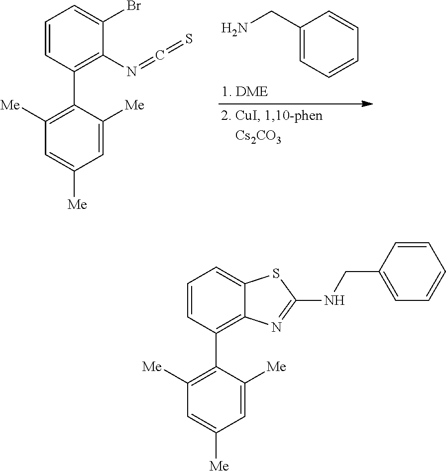 FIG. 5 depicts a six step synthetic scheme to synthesize Ligands 27-29, 31, and 32.