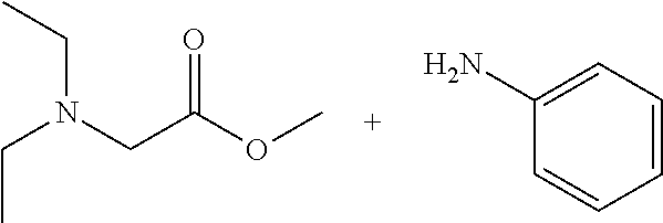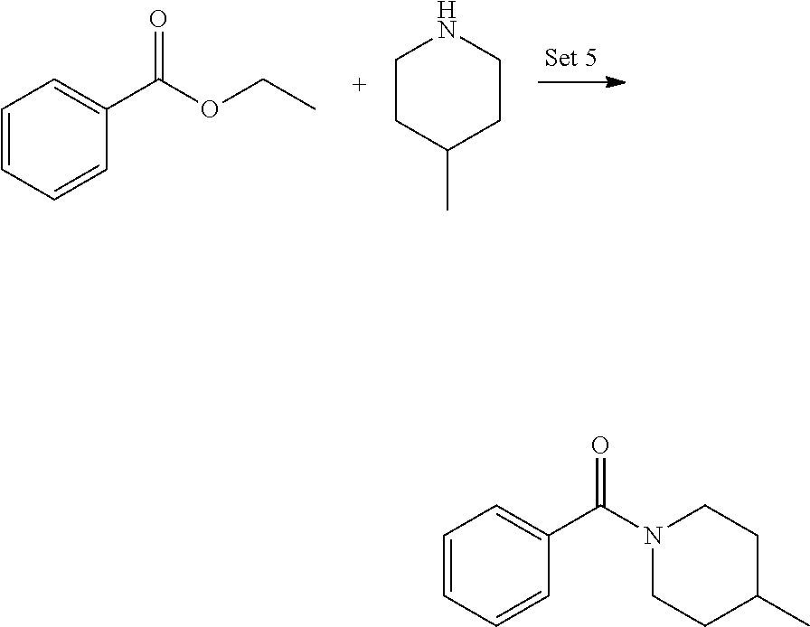 In yet some additional embodiments, the engineered carboxyesterases comprise at least one substitution selected from: X268A, X63A/R, X189Q/I/E, X214R, X282G/C, X381L, and X69W, wherein the substitutions are numbered with reference to SEQ ID NO:2, and wherein the engineered carboxyesterase exhibits greater activity than wild-type T. fusca carboxyesterase on a secondary amine for formation of 1-benzoyl-4-methyl-piperidine from ethyl benzoate and 4-methyl-piperidine, as shown in the following schematic.