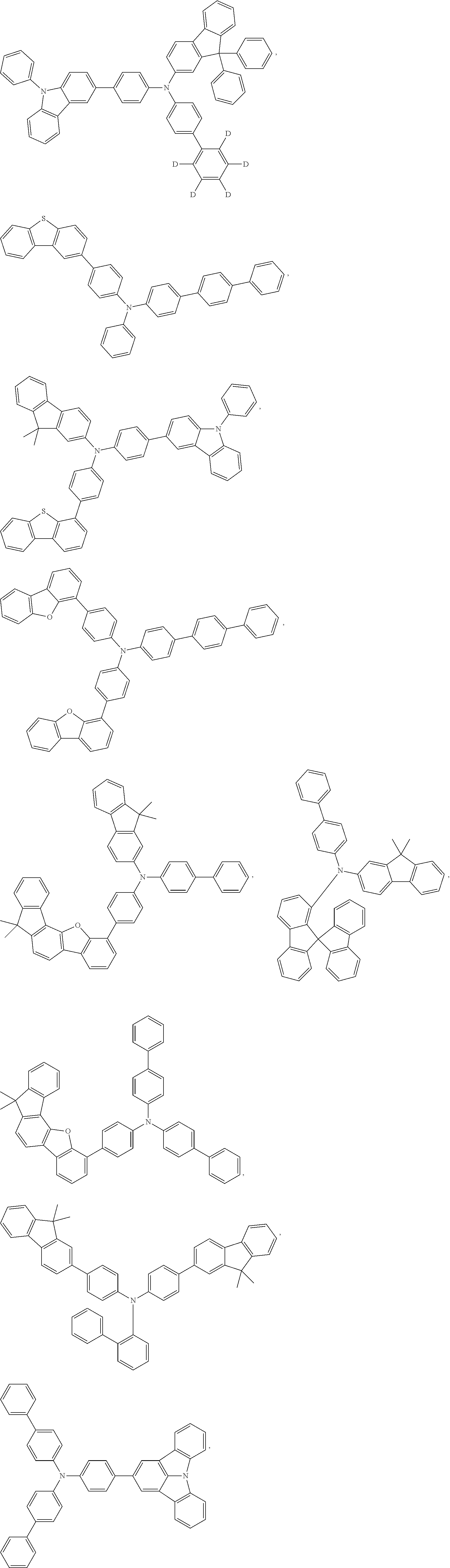 Non-limiting examples of the HIL and HTL materials that may be used in an OLED in combination with materials disclosed herein are exemplified below together with references that disclose those materials: CN102702075, DE102012005215, EP01624500, EP01698613, EP01806334, EP01930964, EP01972613, EP01997799, EP02011790, EP02055700, EP02055701, EP1725079, EP2085382, EP2660300, EP650955, JP07-073529, JP2005112765, JP2007091719, JP2008021687, JP2014-009196, KR20110088898, KR20130077473, TW201139402, U.S. Ser. No. 06/517,957, US20020158242, US20030162053, US20050123751, US20060182993, US20060240279, US20070145888, US20070181874, US20070278938, US20080014464, US20080091025, US20080106190, US20080124572, US20080145707, US20080220265, US20080233434, US20080303417, US2008107919, US20090115320, US20090167161, US2009066235, US2011007385, US20110163302, US2011240968, US2011278551, US2012205642, US2013241401, US20140117329, US2014183517, U.S. Pat. Nos. 5,061,569, 5,639,914, WO05075451, WO07125714, WO08023550, WO08023759, WO2009145016, WO2010061824, WO2011075644, WO2012177006, WO2013018530, WO2013039073, WO2013087142, WO2013118812, WO2013120577, WO2013157367, WO2013175747, WO2014002873, WO2014015935, WO2014015937, WO2014030872, WO2014030921, WO2014034791, WO2014104514, WO2014157018.