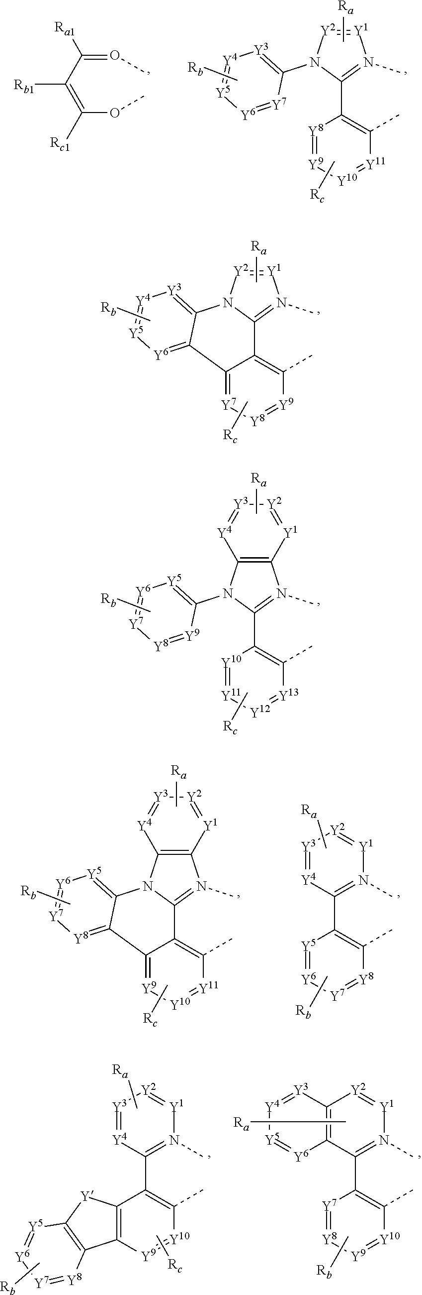 - each of R, R A , R B , and R C is independently a hydrogen or a substituent selected from the group consisting of the general substituents defined herein; and any two adjacent R, R A , R B , and R C can be joined or fused together to form a ring