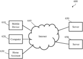 FIG. 6 is a system diagram 600 showing connections between a user device and a server, according to some embodiments of the present disclosure. The server 650 may be configured connect to the Internet and communicate with various user devices, such as the mobile device 610, the computer 620, or the home assistant device 630. In some embodiments, the mobile device 610 may be configured to connect to the Internet through a communication module within the mobile device, such as the communication module 150 shown in FIG. 1 . In some embodiments, the communication module may include one or more cellular communication interfaces, such as a 4G Long-Term Evolution (LTE) interface. In some embodiments, the communication module may include a Wi-Fi interface configured to connect and communicate with a Wi-Fi network.