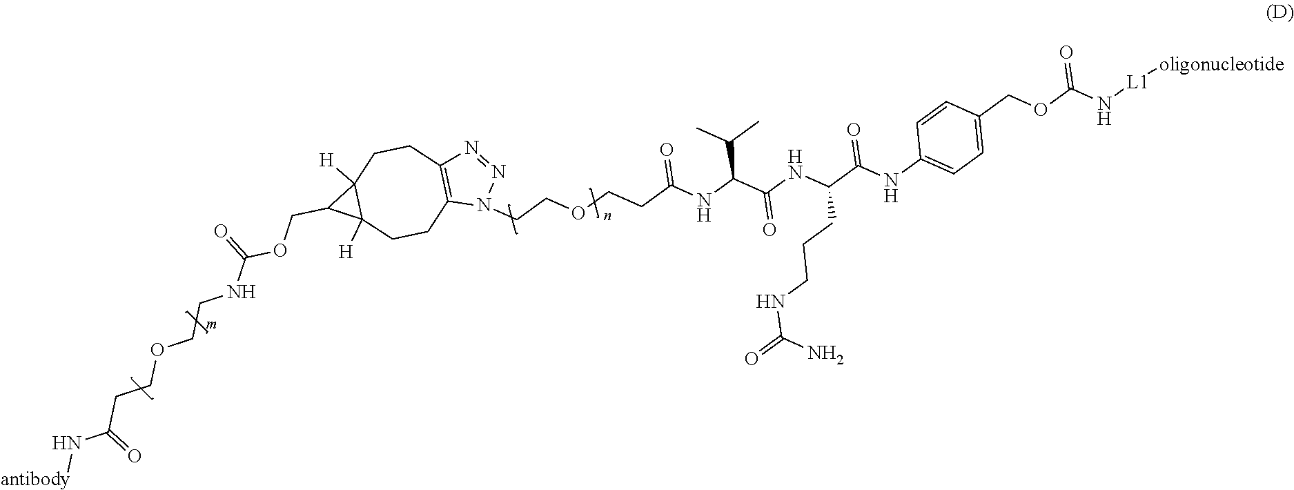 55. The complex of any one of embodiments 1 to 53, wherein the antibody is covalently linked to the oligonucleotide via conjugation to a lysine residue or a cysteine residue of the antibody.
