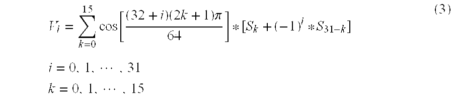 - the inverse Modified Discrete Cosine Transform (IMDCT) V i of a sequence S k (where N i is the cosine function defined in equation (1), below), and the inverse Pseudo Quadrature Mirror Filter (IPQMF) U ij (defined as a function of IMDCT V i , where D i is a standard windowing coefficient as defined the MPEG standard ISO CO 11172-3) will be realized, as shown in FIG. 2 .