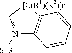 The following compounds were obtained via this procedure: diphenylaminosulfur trifluoride (2), 1H NMR (CDCl3) δ 7.5-7.3 (m, 10H), 19F NMR (CDCl3) δ 69.5 (d, 2F), 31 (t, 1F).4,4′-dimethyl-diphenylamino-sulfur trifluoride (4).1H NMR (CDCl3) δ 7.35-7.10 (m, 8H), 2.35 (s, 6H).19F NMR (CDCl3) δ 68.25 (d, 2F), 32.0 (t, 1F).4,4′-dimethoxy-diphenylaminosulfur trifluoride (6).1H NMR (CDCl3) δ 7.25 (d, 4H), 7.35 (d, 4H), 3.8 (s, 6H).19F NMR (CDCl3) δ 68.5 (s, br, 2F), 31.75 (s, br, 1F) N-4-chlorophenyl-N-phenylaminosulfur trifluoride (8).1H NMR (CDCl3) δ 7.5-7.25 (m, 9H), 19F NMR (CDCl3) δ 70 (d, 2F), 31 (t, 1F).N-naphthyl-N-phenyl-aminosulfur trifluoride (10).1H NMR (CDCl3) δ 8.4 (d, 0.66H), 8.15 (d, 0.34H), 7.9-6.8 (m, 11H), 19F NMR (CDCl3) δ 71, 66.5 (2(d) 0.66F), 70, 67.5 (2(d), 134F) 33 (t, 1F).Indolineaminosulfur trifluoride (27).1H NMR (CDCl3) δ 7.4 (d, 1H), 7.2 (dd, 2H), 7.0 (d, 1H), 4.3 (t, 2H), 3.1 (t, 2H).19F NMR (CDCl3) δ 60 (br, s, 2F), 20 (br, s, 1F).3,4-dihydro-2H-1,4-benzoxazinesulfur trifluoride (29).1H NMR (CDCl3) δ 7.3-7.1 (m, 2H), 6.8-7.1 (m, 2H), 4.5-4.3 (t, 2H), 4.2-3.9 (t, 2H).19F NMR (CDCl3) δ 63 (br, s, 2F) 11 (br, s, 1F). N-methyl-N-phenylaminosulfur trifluoride (31).1H NMR (CDCl3) δ 7.5-7.3 (m, 3H), 7.3-7.0 (m, 2H) 3.4 (s, 3H) 19F NMR (CDCl3) δ 64 (2F) δ 26 (1F).N-ethyl-N-phenyl aminosulfur trifluoride (33)25.N-2-methoxyethyl-N-phenylaminosulfur trifluoride (35) 1H NMR (CDCl3) δ 7.5-7.35 (m, 3H), 7.35-7.20 (m, 2H), 4.1-3.9 (m, 2H), 3.7-3.5 (m, 2H), 3.30 (s, 3H) 19F NMR (CDCl3) δ 63 (br, s, 2F), 31.5 (br, s, 1F). N-2-methoxyethyl-N-methylaminosulfur trifluoride (37).1H NMR (CDCl3) δ 3.8-3.3 (m, 4H), 3.15 (s, 3H), 2.95 (s, 3H) 19F NMR (CDCl3) δ 56 (s, br, 2F), 23 (s, br, 1F).(S)-2-(methoxymethyl) pyrrolidin-1-yl sulfur trifluoride (39)26 bis (2-methoxyethyl)aminosulfur trifluoride (41) 1H NMR (CDCl3).δ 3.5 (t, 4H), 3.15 (t, 4H), 3.05 (s, 6H) 19F NMR (CDCl3) δ 55 (s, br, 2F) 28 (s, br.1 F).