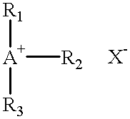wherein A is N, P, or S; R1, R2, and R3 are each independently H, alkyl or alkyl ether of 1-20 carbon atoms, or aryl or alkylaryl having 1-9 carbon atoms, with the proviso that R3 is not present when A is S; and wherein X is an anion selected from the group consisting of halides, conjugate bases of organic acids, and conjugate bases of inorganic acids. The number of pendant ionic moieties should be sufficient to make the salt form of the cationic polymer soluble in the aqueous carrier medium. It will vary depending on the molecular weight of the polymer. The cationic polymer may also contain non-ionic ethylenically unsaturated monomers. The cationic polymers are further described in U.S. Pat. No. 5,555,008 which is incorporated herein by reference.