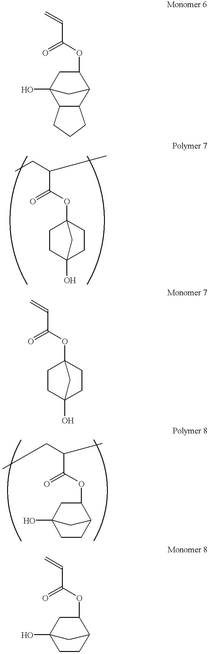 Further, it has been known that, since the wavelengths of absorption bands are shifted not only by alicyclic structure but also condensed polycyclic structure, the transparency at 193 nm can be ensured even by condensed polycyclic structure (T. Ushirogouchi et al., Proc. SPIE, Vol. 2195 (1994), page 205, etc.). Therefore, the object of the present invention can be attained even by vinyl monomers having condensed polycyclic structure.