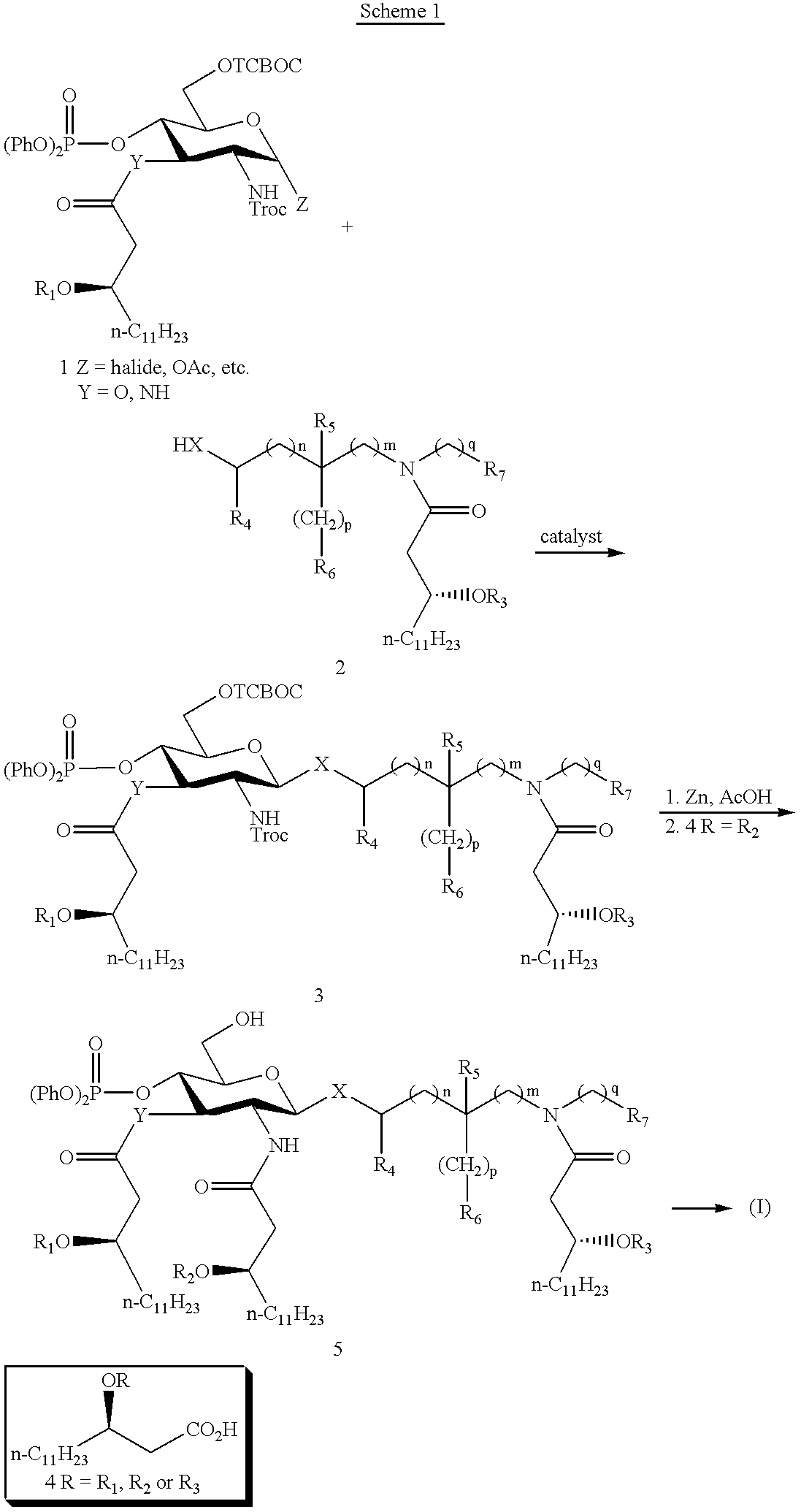 - Glucosaminide unit 1 bears an (R)-3-n-alkanoyloxytetradecanoyl residue on the 3-position, and suitable protecting groups on the 6-hydroxyl and 4-phosphate moieties.