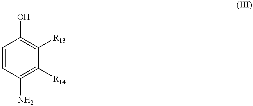 Mention may more particularly be made, among the para-aminophenols of above formula (III), of para-aminophenol, 4-amino-3-methylphenol, 4-amino-3-fluorophenol, 4-amino-3-(hydroxymethyl)phenol, 4-amino-2-methylphenol, 4-amino-2-(hydroxymethyl)phenol, 4-amino-2-(methoxymethyl)phenol, 4-amino-2-(aminomethyl)phenol, 4-amino-2-[(β-hydroxyethyl)aminomethyl]phenol, 4-amino-2-fluorophenol and their addition salts with an acid.