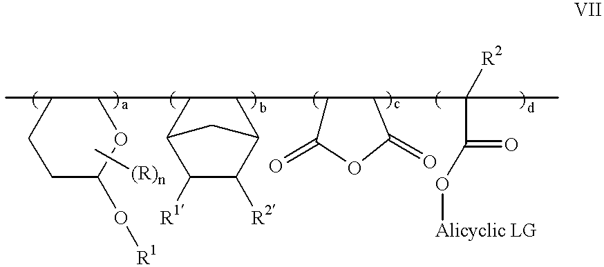 - a polar functional group is formed, e.g., carboxyl or imide, which results in different solubility characteristics in exposed and unexposed areas of the resist coating layer. See also R. D. Allen et al., Proceedings of SPIE, 2724:334-343 (1996); and P. Trefonas et al. Proceedings of the 11th International Conference on Photopolymers (Soc. Of Plastics Engineers), pp 44-58 (Oct. 6, 1997).