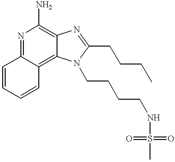 - RJVQNDDUSDQAEI-UHFFFAOYSA-N n-[4-(4-amino-2-butylimidazo[4,5-c]quinolin-1-yl)butyl]methanesulfonamide Chemical compound C1=CC=CC2=C(N(C(CCCC)=N3)CCCCNS(C)(=O)=O)C3=C(N)N=C21 RJVQNDDUSDQAEI-UHFFFAOYSA-N 0.000 claims description 7