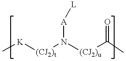 wherein, each J is the same or different and is selected from the group consisting of H, R1, OR1, SR1, NHR1, NR1 2, F, Cl, Br and I. Each K is the same or different and is selected from the group consisting of O, S, NH and NR1. Each R1 is the same or different and is an alkyl group having one to five carbon atoms which may optionally contain a heteroatom or a substituted or unsubstituted aryl group. Each A is selected from the group consisting of a single bond, a group of the formula; —(CJ2)s— and a group of the formula; —(CJ2)sC(O)—, wherein, J is defined above and each s is an integer from one to five. The integer t is 1 or 2 and the integer u is 1 or 2. Each L is the same or different and is independently selected from the group consisting of J, adenine, cytosine, guanine, thymine, uridine, 5-methylcytosine, 2-aminopurine, 2-amino-6-chloropurine, 2,6-diaminopurine, hypoxanthine, pseudoisocytosine, 2-thiouracil, 2-thiothymidine, other naturally occurring nucleobase analogs, other non-naturally occurring nucleobases, substituted and unsubstituted aromatic moieties, biotin, fluorescein and dabcyl. In the most preferred embodiment, a PNA subunit consists of a naturally occurring or non-naturally occurring nucleobase attached to the aza nitrogen of the N-[2-(aminoethyl)]glycine backbone through a methylene carbonyl linkage.