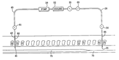 FIG. 4 depicts another embodiment of the spinal cooling device. The device includes first and second catheter 30 and 40, each having, respectively, proximal end 31 and 41, distal end 32 and 42, and lumen 33 and 43. The proximal ends of the catheters are connected to pump and cooling unit 51, capable of providing circulation and cooling of the CSF in the circuit. The proximal end of the first catheter also includes manometer 55 and thermometer 60 for measuring, respectively, CSF pressure and temperature exiting or entering the first catheter. The proximal end of the second catheter also includes second thermometer 61 for measuring CSF temperature exiting or entering the second catheter. When the CSF pressure exceeds a desired threshold, the CSF can be drained from release valve 65 included in the first catheter or port 64 included in the second catheter. Port 64 can also be used to administer fluid or pharmaceutical agents into the subarachnoid space. Each distal end of the catheters carries needle 66, which facilitates introduction of the catheter into the subarachnoid space.