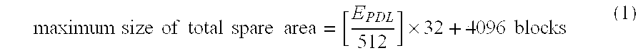 Next, the required amount of the total spare area is calculated in step S102. For example, when the number of PDL entries is between 3072 and 3583, the minimum size of a total spare area is the sum of all spare areas required to process the PDL entries and a spare area required to process SDL entries for one sector, and thus becomes 480 ECC blocks. If a 32 Kbyte buffer is used, and the increment between necessary spare areas is 32 blocks, 2752 ECC blocks obtained by calculation using Equation 2 can be allocated as the maximum size of spare area.