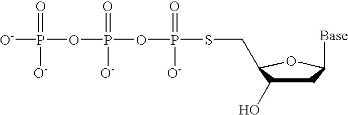 When referring to sequences of nucleotides in a polynucleotide, it is customary to use the abbreviation for the base; i.e., A, C, G, and T (or U) to represent the entire nucleotide containing that base. For example, a polynucleotide sequence denoted as “ACG” means that an adenine nucleotide is bonded through a phosphate ester linkage to a cytosine nucleotide that is bonded through another phosphate ester linkage to a guanine nucleotide. If the polynucleotide being described is DNA, then it is understood that “A” refers to an adenine nucleotide that contains a deoxyribose sugar. If there is any possibility of ambiguity, the “A” of a DNA molecule can be designated “deoxyA” or simply “dA.” The same is true for C and G. Since T occurs only in DNA and not RNA, there can be no ambiguity so there is no need to refer to deoxyT or dT.