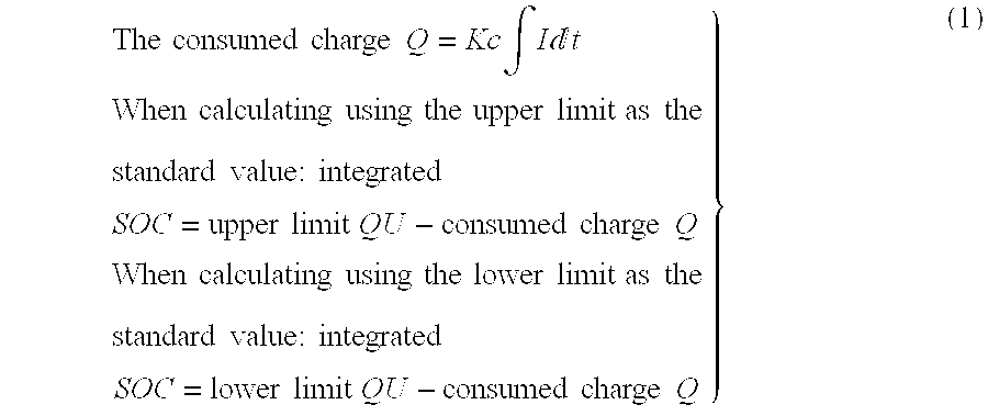 Note that when the integrated state of charge calculating portion 32 calculates the consumed charge Q by accumulating the charge and discharge current I, the integrated amount of charge and discharge current I is estimated using the predetermined upper limit QU and the lower limit QL as the initial value.