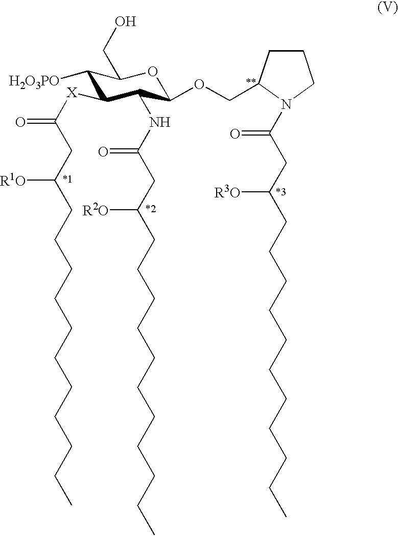 and (N-[(R)-3-decanoyloxytetradecanoyl]-(S)-2-pyrrolidinylmethyl 2-deoxy-4-O-phosphono-2-[(R)-3-decanoyloxytetradecanoylamino]-3-O-[(R)-3-decanoyloxytetradecanoyl]-β-D-glucopoyranoside, Formula (IV),