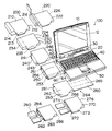 In order to allow part of the expansion unit 200 to project from the bottom surface of the base 20, the opening 62 has an opening 63 at the bottom of the base 20 in FIG. 1. The opening 63 allows not only the thick-type expansion unit 240 to be inserted, but also the inserted expansion unit to serve as a tilt stand. A further explanation of this configuration will be given later together with an expansion unit 260. A cover (not shown) that fits the opening 63 may be provided; when the cover removed and the openings 62 and 64 are exposed, the thick expansion units 240 and 260 may become inserted. Such a cover may be attached via a spring or hinge structure at the bottom of the base 20. Naturally, the opening 63 is optional and may be removed from the bottom of the base 20 in the notebook PC 100 which does not use the thick expansion units 240 and 260.