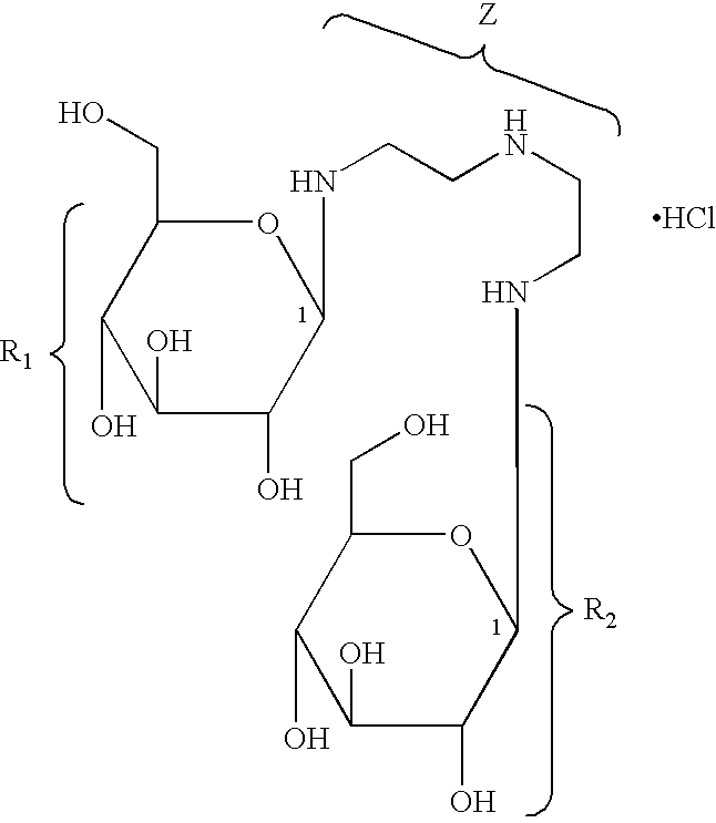 As described above, each of R1 and R2 can represent a variety of saccharide residues while Z is an aliphatic polyamino linker. Some specific examples prepared by this method include diglucosyl diethylenetriamine, difucosyl diethylenetriamine, digalactosyl diethylenetriamine, and diallosyl diethylenetriamine.