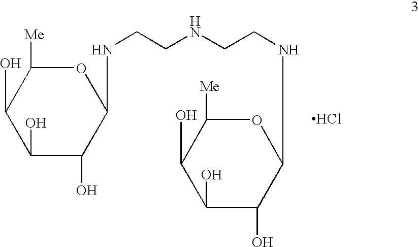 2 is glucosyl and the polyamino linker is a residue of diethylenetriamine. The diglucosyl-diethylenetriamine can be prepared in a salt form such as a HCl salt. The structure of diglucosyl-diethylenetriamine.HCl (1) is shown below: