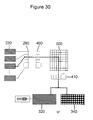FIG. 29 shows an embodiment of the microfluidic device wherein the array of m positive pressure source reservoirs or pumps is multiplexed to an n×n crossed channel array of fluidic locations by means of 1×n input and n×1 output valve manifolds.