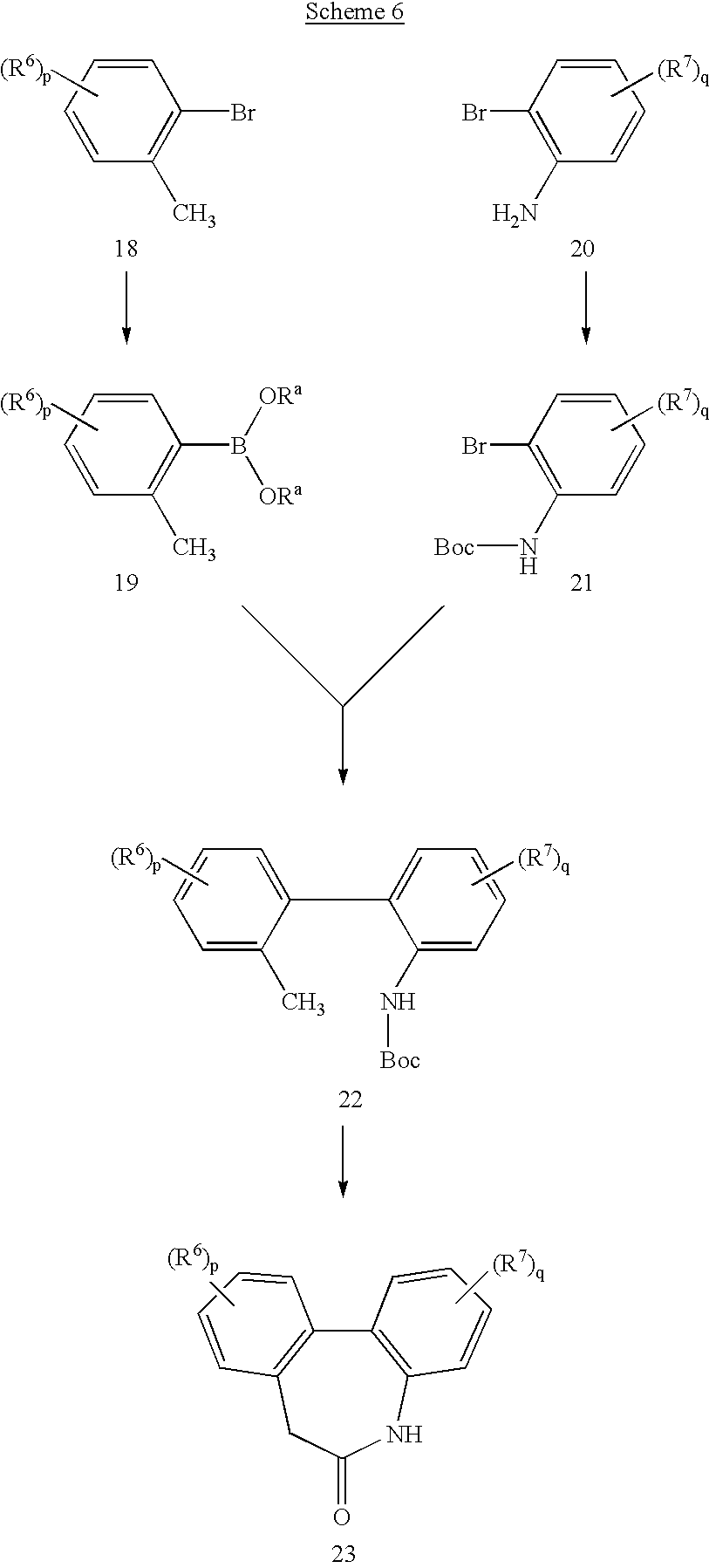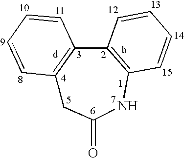 This example illustrates how the compounds of this invention could be tested for in vivo suppression of β-amyloid release and/or synthesis. For these experiments, 3 to 4 month old PDAPP mice are used [Games et al., (1995) Nature 373:523-527].19 Depending upon which compound is being tested, the compound is usually formulated at between 1 and 10 mg/mL. Because of the low solubility factors of the compounds, they may be formulated with various vehicles, such as corn oil (Safeway, South San Francisco, Calif.); 10% ethanol in corn oil; 2-hydroxypropyl-β-cyclodextrin (Research Biochemicals International, Natick Mass.); and carboxy-methyl-cellulose (Sigma Chemical Co., St. Louis Mo.).